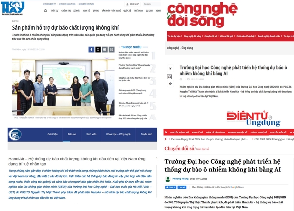 🥰 Điều khiến nhóm vui mừng là nhiều tờ báo lớn và uy tín đã sử dụng dữ liệu dự báo của VietnamAir để đưa tin. Đến nay có khoảng 20 bài báo của 9 tờ báo đã đưa tin: ❣️VNExpress: Các bài phân tích về tình hình ô nhiễm ở Hà Nội ❣️ Báo Khoa học & Phát triển: chuỗi bản tin dự báo chất lượng không khí toàn quốc hàng tuần từ 5/2025 đến nay và các phân tích chuyên sâu về ONKK ❣️Tiền Phong: Ứng dụng AI trong dự báo và các bản tin về tình trạng ô nhiễm nghiêm trọng tại Hà Nội. ❣️ Nhân Dân, Công nghệ & Đời sống, Điện tử ứng dụng và UETNews: các bài giới thiệu sản phẩm hệ thống dự báo của nhóm. ❣️ Báo mới, Lao Động, Sức khỏe & Đời sống: nhiều bài cập nhật về diễn biến ô nhiễm, trong đó có sử dụng số liệu dự báo từ GEOILAB. ✨Đây là nguồn động lực lớn để GEOILAB tiếp tục nghiên cứu, cải thiện và mang đến một hệ thống dự báo không khí tin cậy hơn cho cộng đồng.