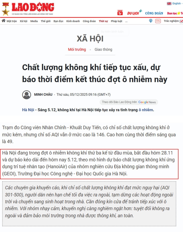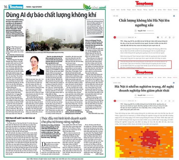 🥰 Điều khiến nhóm vui mừng là nhiều tờ báo lớn và uy tín đã sử dụng dữ liệu dự báo của VietnamAir để đưa tin. Đến nay có khoảng 20 bài báo của 9 tờ báo đã đưa tin: ❣️VNExpress: Các bài phân tích về tình hình ô nhiễm ở Hà Nội ❣️ Báo Khoa học & Phát triển: chuỗi bản tin dự báo chất lượng không khí toàn quốc hàng tuần từ 5/2025 đến nay và các phân tích chuyên sâu về ONKK ❣️Tiền Phong: Ứng dụng AI trong dự báo và các bản tin về tình trạng ô nhiễm nghiêm trọng tại Hà Nội. ❣️ Nhân Dân, Công nghệ & Đời sống, Điện tử ứng dụng và UETNews: các bài giới thiệu sản phẩm hệ thống dự báo của nhóm. ❣️ Báo mới, Lao Động, Sức khỏe & Đời sống: nhiều bài cập nhật về diễn biến ô nhiễm, trong đó có sử dụng số liệu dự báo từ GEOILAB. ✨Đây là nguồn động lực lớn để GEOILAB tiếp tục nghiên cứu, cải thiện và mang đến một hệ thống dự báo không khí tin cậy hơn cho cộng đồng.